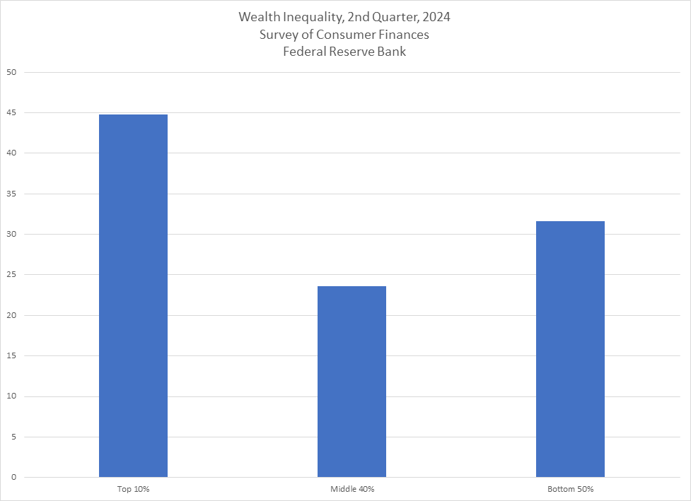 Economists analyze wealth by dividing the economy into 3, 4 or 5 groups depending on how you want to analyze the rich. We will use three groups, but no matter how you divide the pie, the rich own nearly 50% of the wealth in the US. Our three groups are: the poor and lower middle class (bottom 50%), the middle class (40%), and the rich (10%). The chart below shows the wealth dis