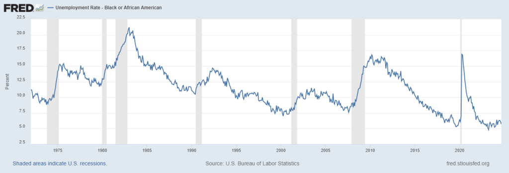 US national unemployment is 4.0% a historic low. Black unemployment is also at a historic low: 5.7% in September, 2024. It is important to note that Black unemployment is traditionally twice that of White unemployment and spiked to 17% during Covid-19. The chart below shows Black unemployment since 1970.