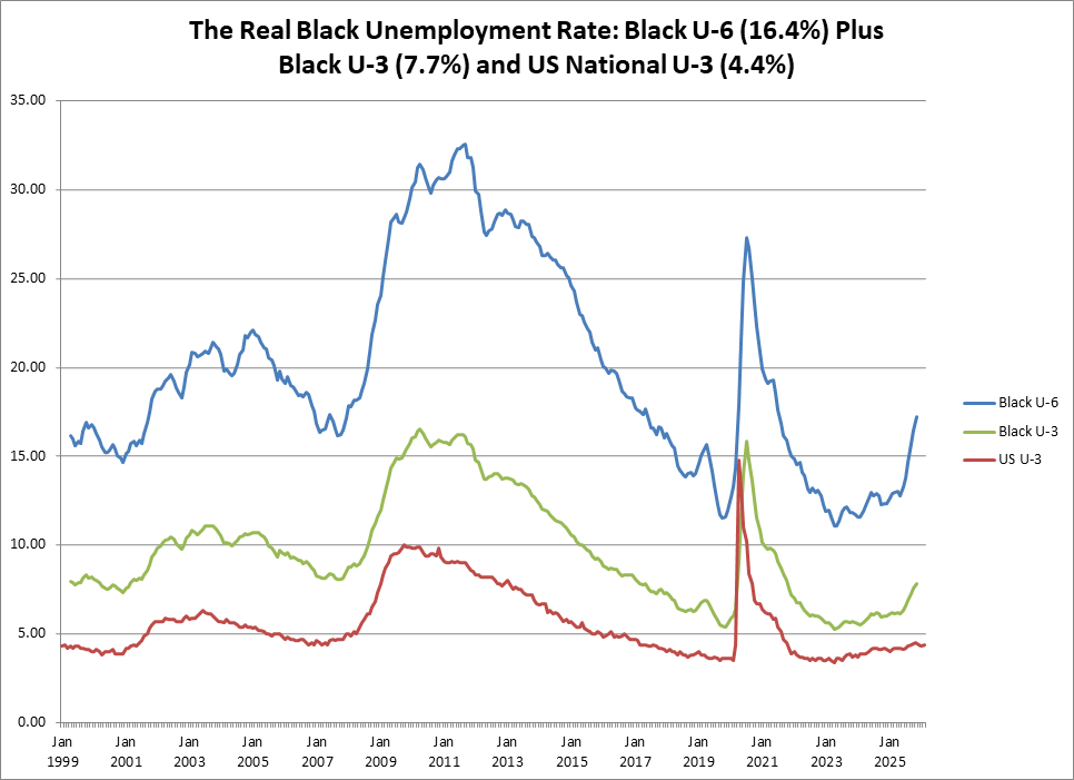 Black unemployment always signals a problem for the larger economy. This time, it might be structural. The current labor market is dominated by uncertainty and technological change (AI). We are looking at a period of stagflation with little job growth. And the Federal Reserve (Monetary policy only) cannot do anything about a fiscal policy problem. Only Congress can address fiscal problems.