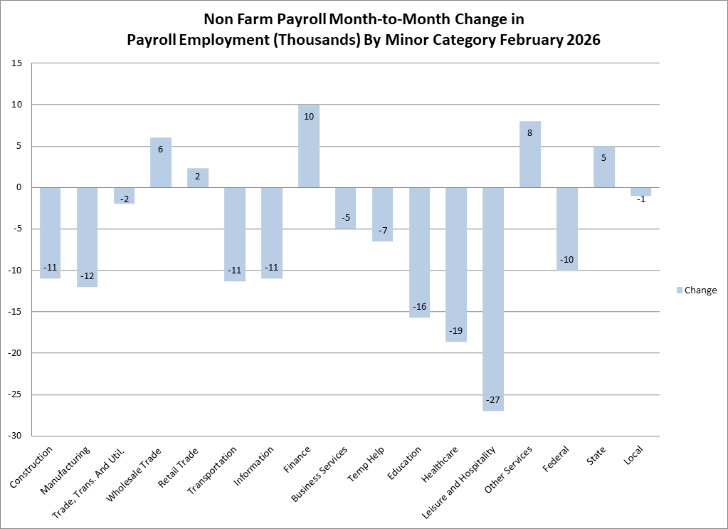 The economy lost jobs in two normally resilient sectors: healthcare and hospitality. Healthcare lost -18,600 jobs while hospitality shed -27,000 positions. Job losses were widespread, hitting construction (-11K), manufacturing(-12K), and Information Technology(-11K). Only financial services (+10K) add jobs.