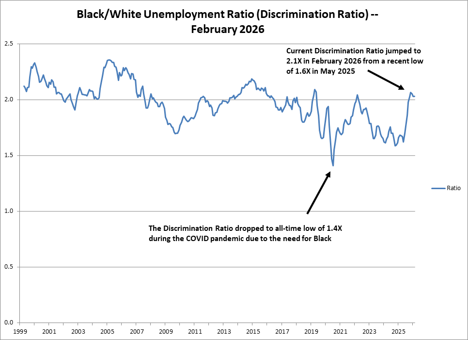 The Discrimination ratio, which is the number of unemployed Blacks compared to unemployed Whites, increased to 2.08X. Historically, the rate has been 2X or twice as high. During COVID, it dropped to a record low of 1.4X as employers struggled to find employees who would take “dangerous” jobs.