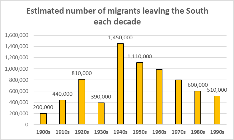 There were multiple migrations by US Blacks out of the South to Northern, Midwestern, and Western cities. More than 6 million Blacks along with 15 million Whites left the South. The period lasted from 1910 to 2000. The peaks were between 1910-1930 and 1940 to 1970.