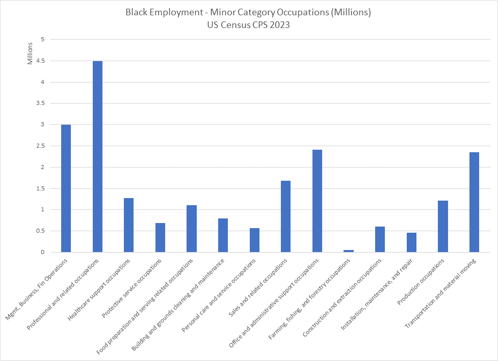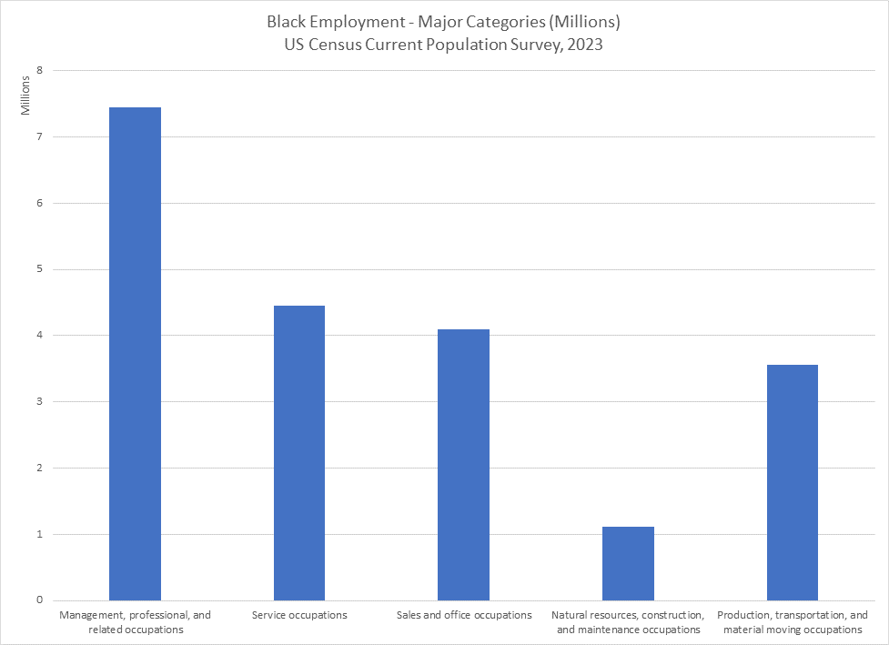 Black people work throughout the economy except in farming and construction. We have also done well moving into management in service occupations. We are over-represented in manufacturing and logistics work (transportation and warehousing).