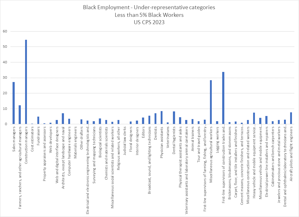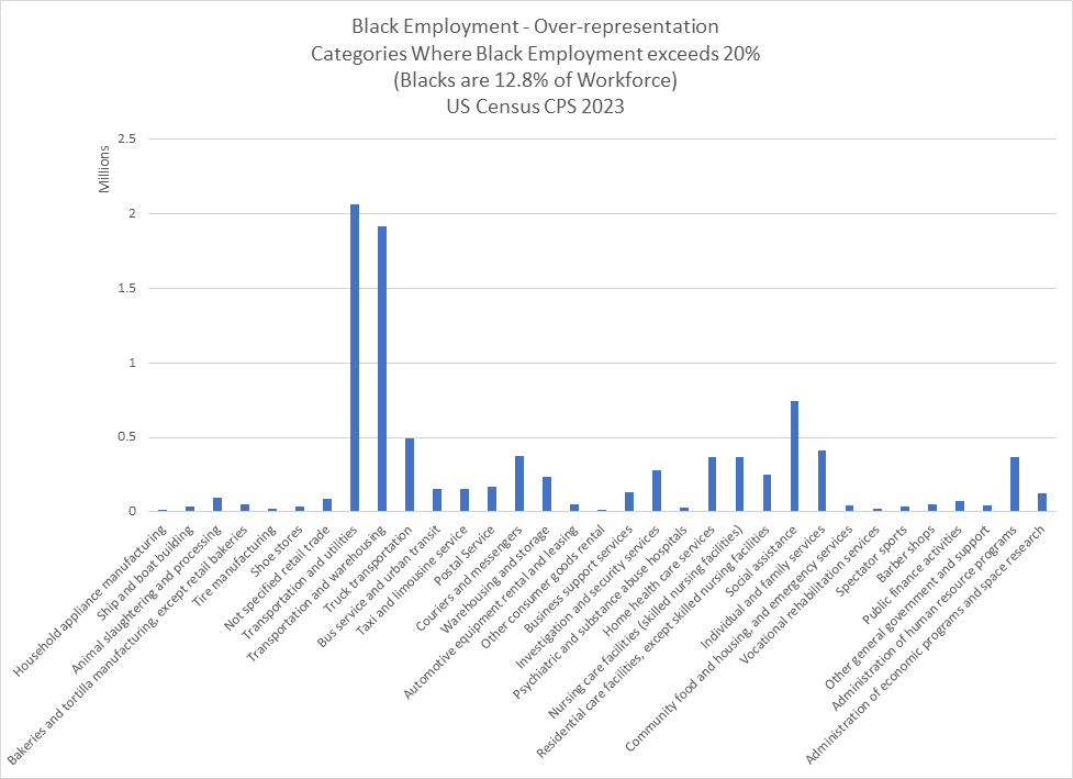 This chart is one of the most interesting. It’s about where Black people don’t work. In general, Blacks don’t work in construction and farming and related industries. Some higher-end professional categories show up like dentists. But more interesting is Black are under-employed in “White-relationship” industries like sales managers, architecture, and software at but at lower levels.