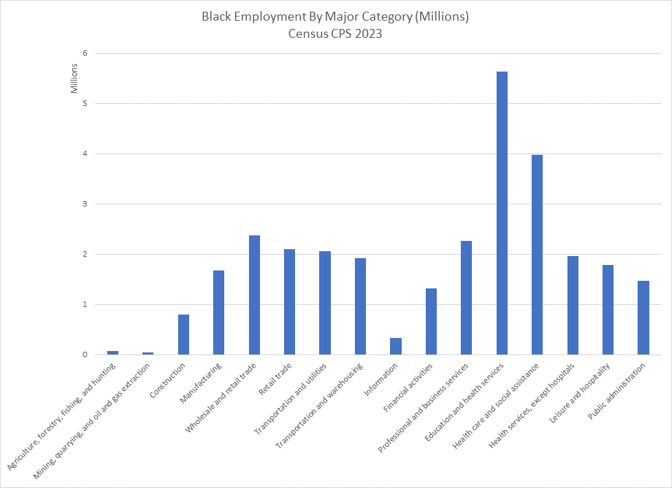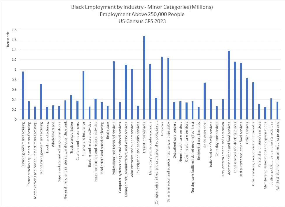 We also have to discuss occupation versus industry. A manager is a manager and a warehouse worker does almost the same job regardless of industry. However, industry trends show which industries are friendlier to Black employment and which are not.