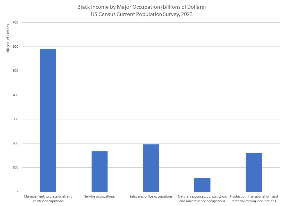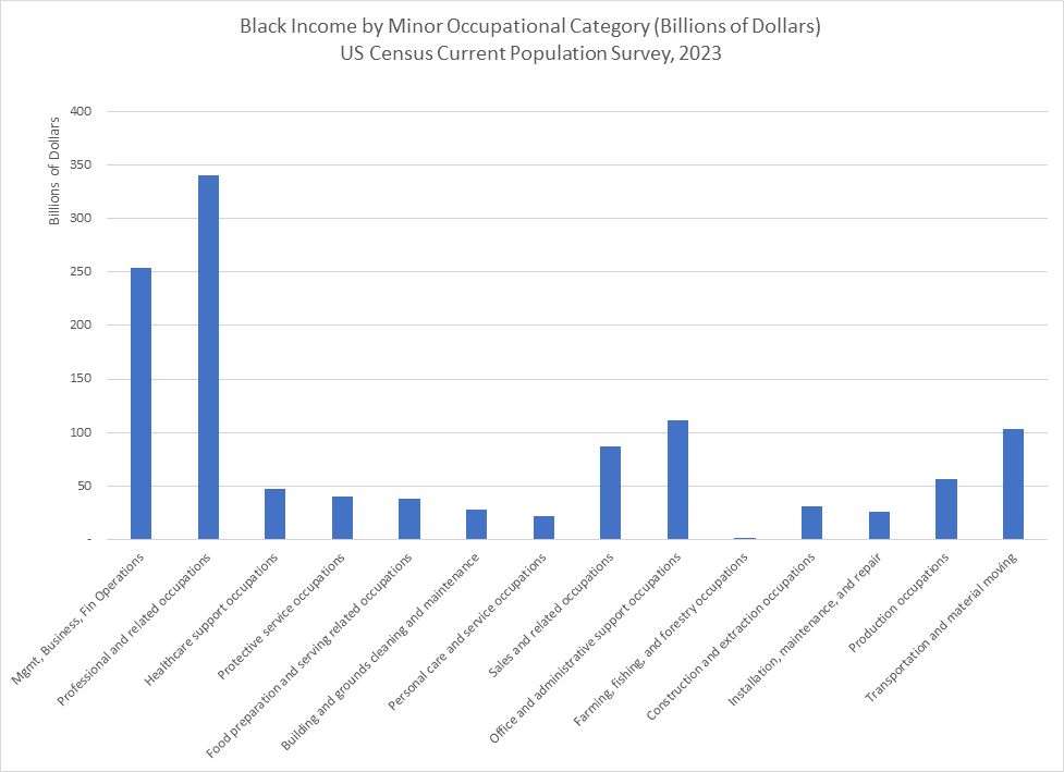 Black income by category shows a much broader view of which occupations create the most Black income. While total employment is important, Black income is also important. The graph shows that income from employment is widely spread for Black workers. At the sub-category level, we get a better flavor of who makes money and in what occupation. We see evidence of the split between high-income employment and low-income employment. Once again, management, business and finance, education, and health care have relatively high levels of income. While logistics, delivery and material moving have small incomes.
