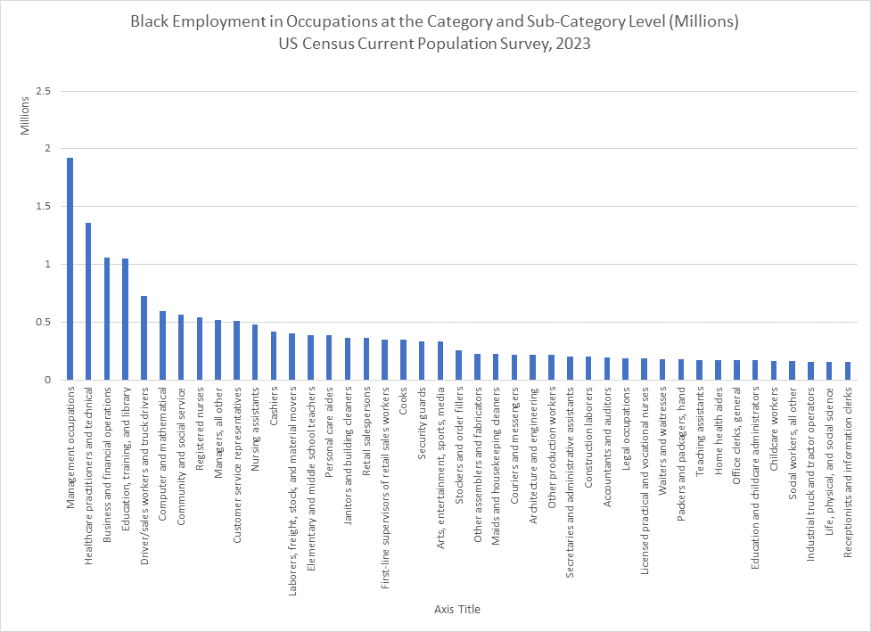 This chart better shows the employment details. We are looking at the biggest categories where Black people work. There are about 15-20 job categories where Black employment is concentrated. We work in management, healthcare, and transportation that dominate the employment categories but when you get into the details you can find interesting stories. It is important to note high levels of Black employment in finance, education, healthcare, customer service, and delivery services.